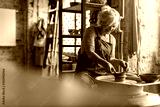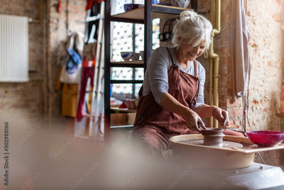 Hand made ceramics are formed by a mature woman on a potters wheel
