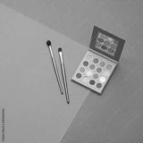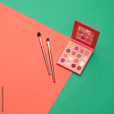 Cosmetic makeup accessories flat lay. Fashion creative minimal Set. Trendy eye shadow palette, brushes. Art colorful geometry pink Style. Beauty cosmetic make up tools, fashionable concept