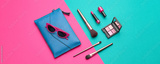 Fashion concept beauty product layout. Woman Essentials cosmetic makeup Set. Collection beauty accessories. Trendy Clutch, Brushes, lipstick. Coloful pink art. Creative make up banner Flat lay