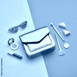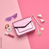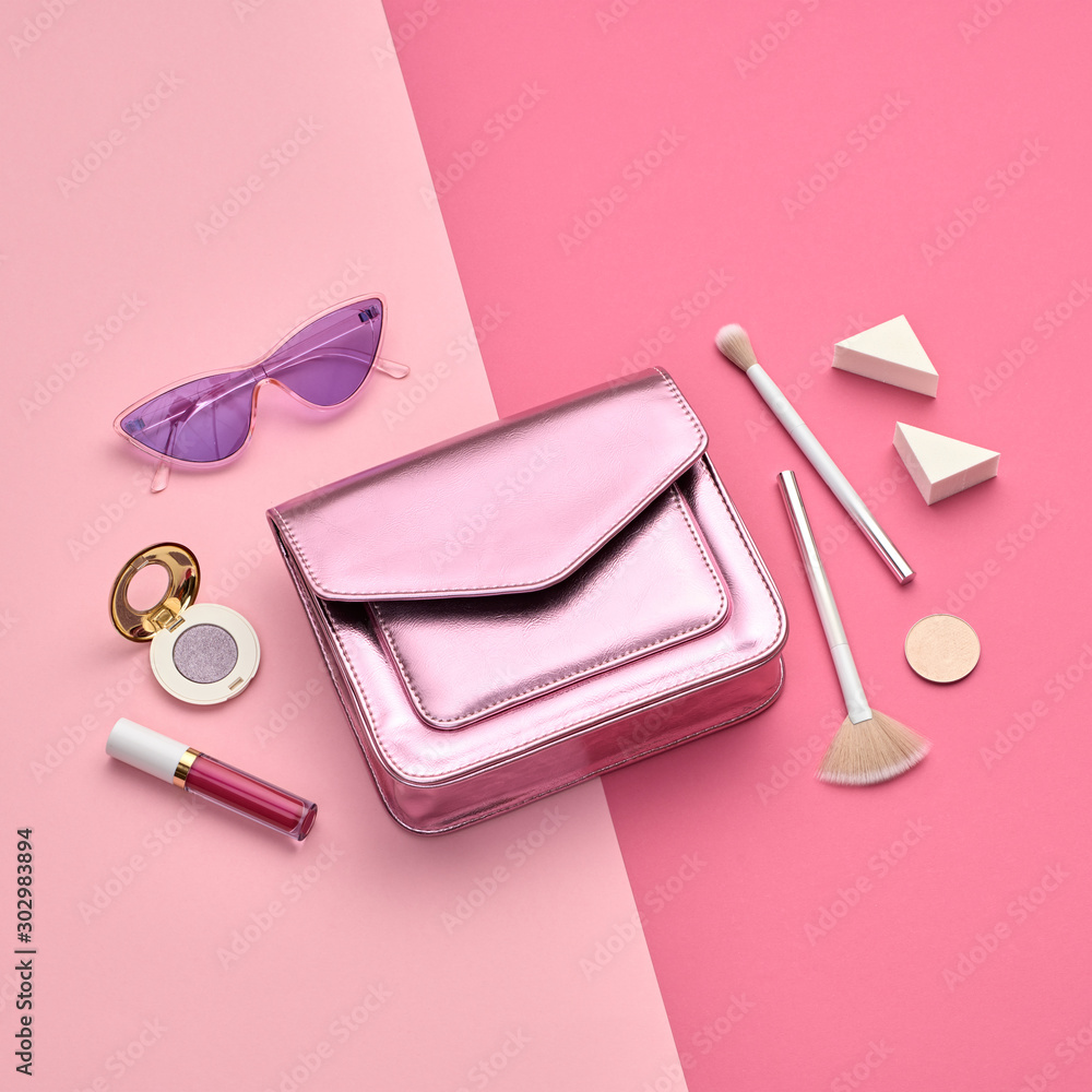 Fashion concept beauty product. Woman Essentials cosmetic makeup pink Set. Collection beauty accessories. Trendy Clutch, Brushes, lipstick. Coloful pink art Flat lay. Creative make up glamor concept