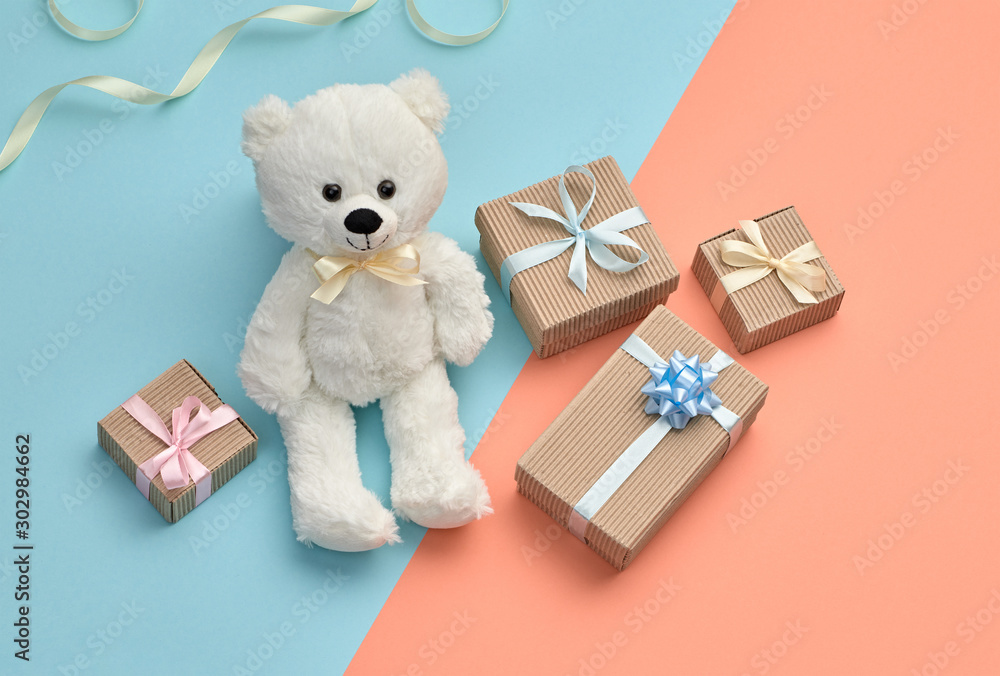 Valentines Day. Teddy Bear with gift boxes, ribbon. Creative art fashion greeting card. Pastel design coral blue color, cute toy bear and presents. Flat lay. Holiday gift shopping fashionable concept