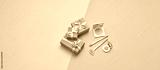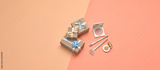 Gift boxes, ribbon, beauty product pastel set. Minimal. Creative art fashion Flat lay. Presents, cosmetic makeup accessory on design coral beige color. Holiday make up shopping fashionable banner
