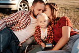 Happy Young Family Mom and Dad with Their Little Son Enjoying Summer Weekend Picnic Sitting on the Plaid Near the Car Outside the City in the Field at Sunny Day Sunset, Vacation and Road Trip Concept
