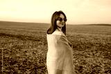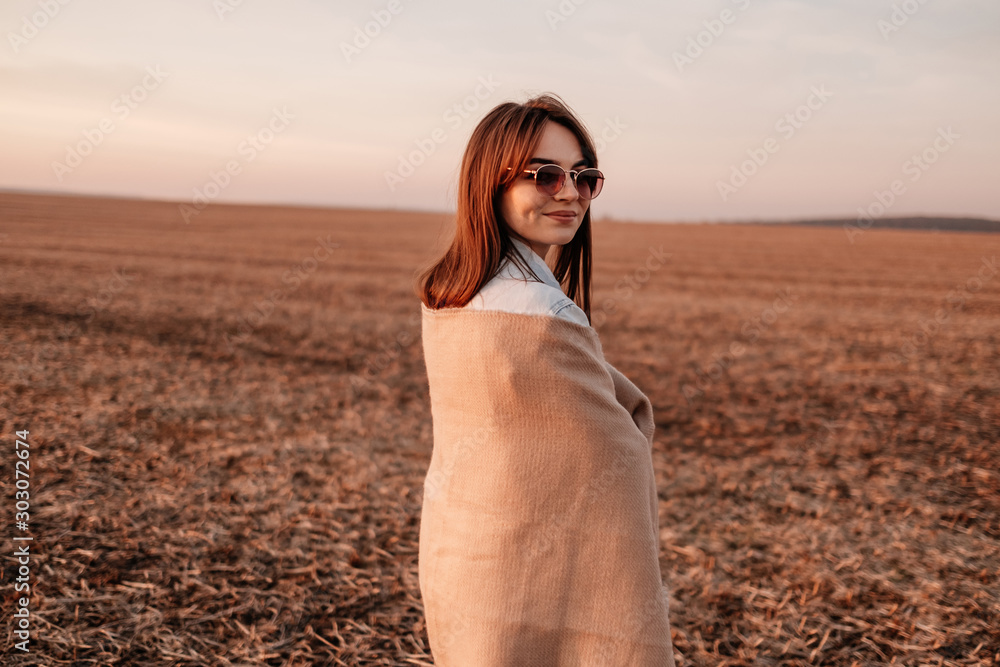 Portrait of One Beautiful Stylish Girl Dressed in Jeans Jacket, Having a Good Time Outside the City on the Field at Sunset