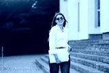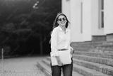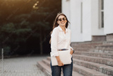 Portrait of One Fashionable Girl Dressed in Jeans and White Shirt Holding Laptop, Freelance Worker, Business Lady, Woman Power Concept
