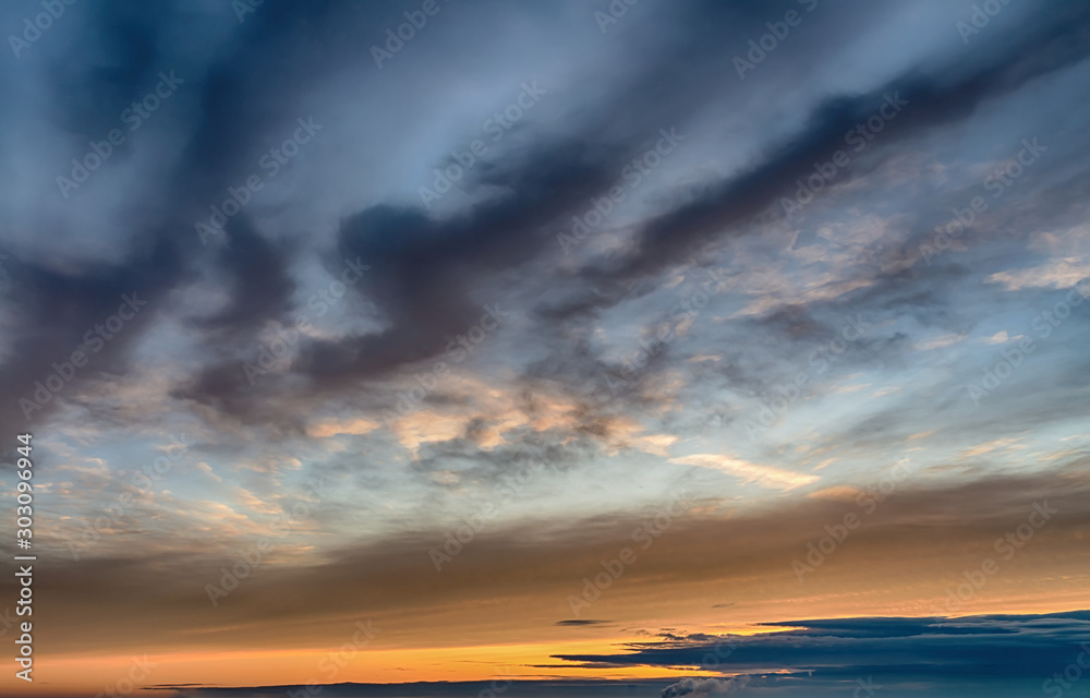 Fantastic dark blue thunderclouds at sunrise, natural composition