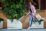 Smiling brunette in sunglasses. The girl runs and carries paper bags with purchases. The concept of shopping, discounts, black bowl and lifestyle.