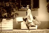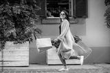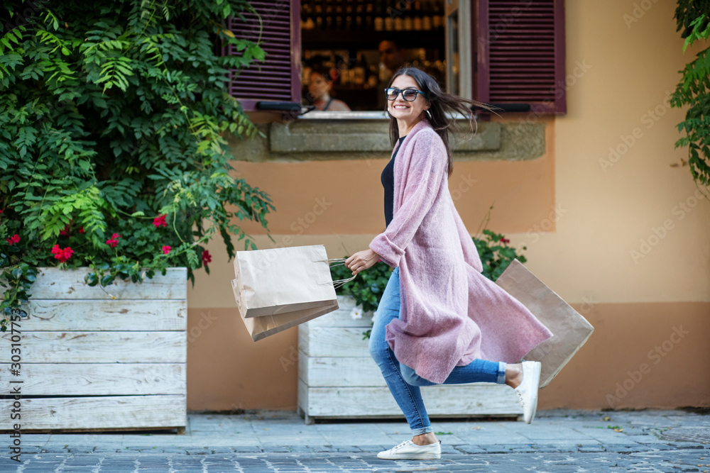 The woman is laughing. The girl runs and bounces with paper bags in her hands. The concept of shopping, discounts, black bowl and lifestyle.