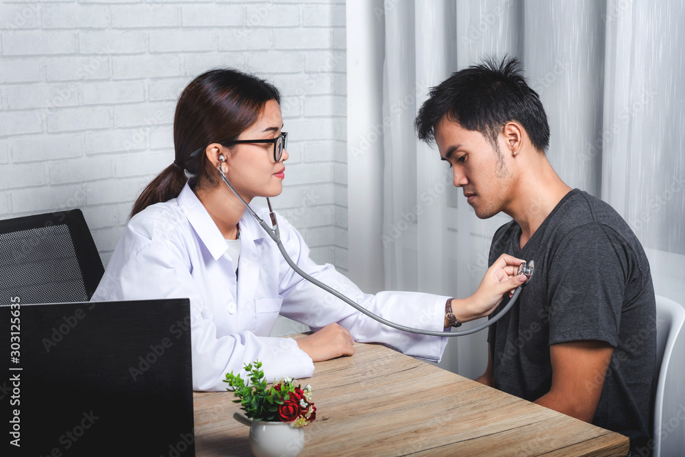 Young Asian female doctor examining young man patient. Woman doctor examining man by stethoscope in clinic. Healthcare and medical concept