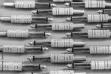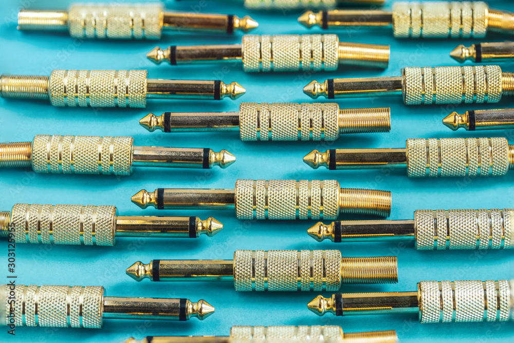 Close up of many golden audio jack over blue background, pattern, texture background. Image stack