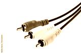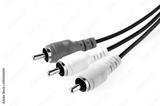 Yellow, white, red, RCA plug with black cable connect to audio and video isolated on white background. Image stack