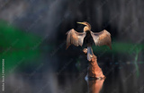 Anhinga perched on a falling tree with wings and tail spread to dry