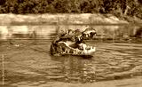 Close up of a Yacare caiman eating piranha