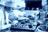 Children grind vegetables in the kitchen.