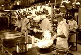 Modern kitchen. Cooks prepare meals on the stove in the kitchen of the restaurant or hotel. The fire in the kitchen.