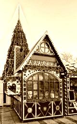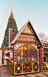 Christmas tree and gingerbread house stall at Cathedral square in Vilnius in Lithuania.