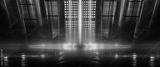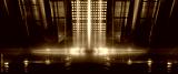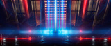 Background of empty show scene. Empty dark modern abstract neon background. Glow of neon lights on an empty stage, diodes, rays and lines. Lights of the night city.