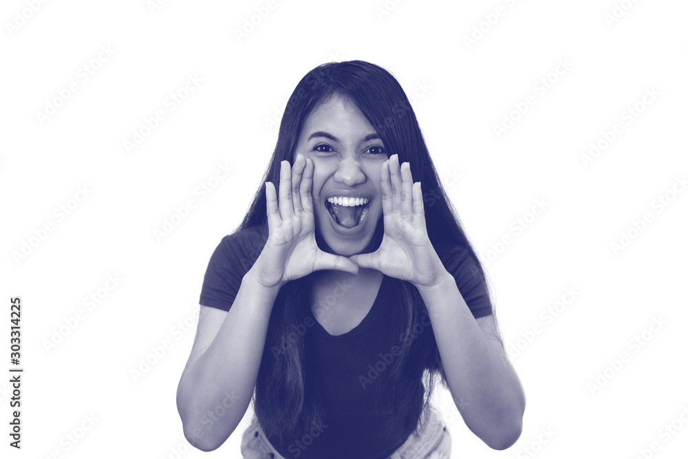 Young Asian woman shouting and screaming with blue duotone filter - Millennial lifestyle girl with cupped hands around mouth isolated on white background - communication, advertising and help concept