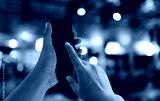 Hand of a businessman hold smartphone and use finger point to empty screen.