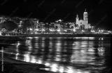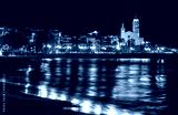 coastal town at night with lighting on the promenade and church in the background - image