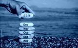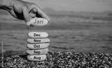 Happy New Year 2020 is coming concept. Turn of old year 2019 change to 2020. 2020 replace 2019. New hopes, growth, ideas, excitement background. Man / male hand adding stone to pebble tower. Low view