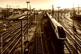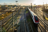 Modern commuter train on a European railway station at sunrise with rail tracks and trains