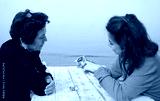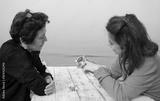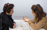 Fortune telling and traditional turkish coffee concept on coast. Woman telling fortune to elder woman by inspecting the brown grounds remaining in coffee cup. Young woman guessing on coffee grounds.