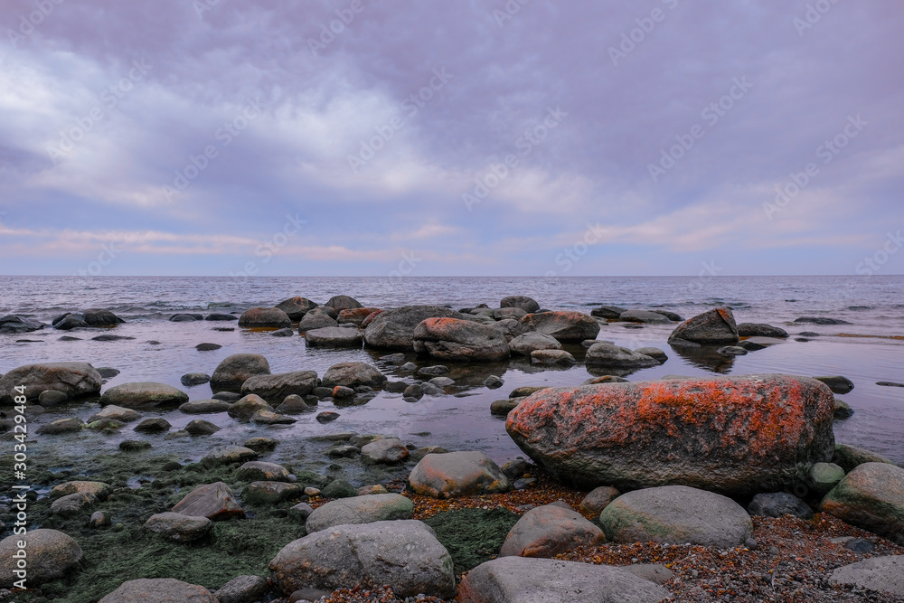 Boulders on a sea shore. Wild rocky seashore on a cloudy day. Fabulous seascape.