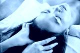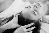 Close-up image of beautician massaging head of female client relaxing on massage bed