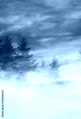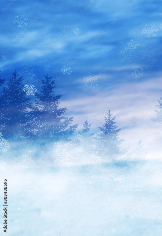 Winter forest background. Snow, fog, moonlight. Winter landscape
