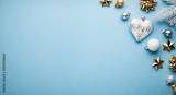 Merry Christmas and Happy Holidays greeting card, frame, banner. New Year. Noel. Christmas white and golden ornaments on blue background top view. Winter xmas holiday theme