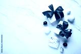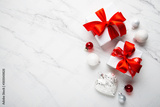 Merry Christmas and Happy Holidays greeting card, frame, banner. New Year. Noel. Christmas gifts and red decor on white marble background top view. Winter xmas holiday theme