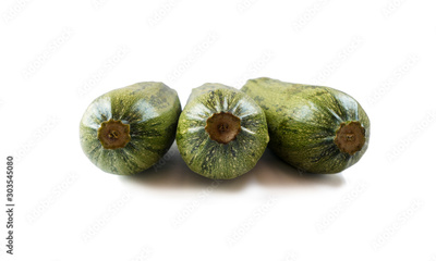 Fresh cut zucchini isolated on a white background. Design element for product label. Design image of fresh whole zucchini. Green zucchini vegetables isolated on white.