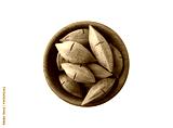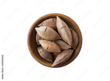 Studio shot of brazil nuts on white background. Brazil nuts in nutshell on wooden bowl isolated on white. Brazil nuts with copy space for text. Nuts close-up. Top view.