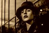 Outdoor close up fashion portrait of young beautiful confident model, woman wearing trendy faux leather bucket hat, long earrings, trench coat, posing in city street. Copy, empty space for text