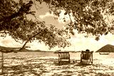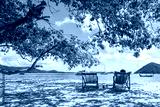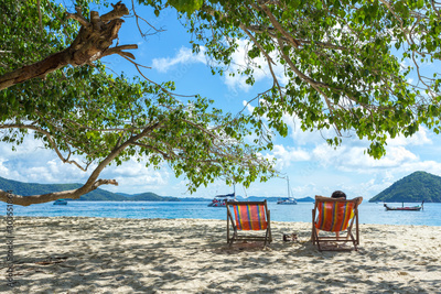 Sunbeds on a paradise island under a tree, sunny day by the sea shore of a resort