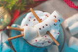 Christmas background with a marshmallow man lying in a mug with cocoa, in the background a Christmas tree with toys, a garland and gifts