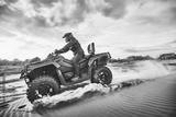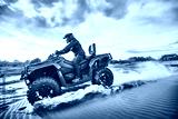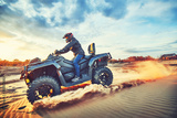 Teen riding ATV in sand dunes making a turn in the sand