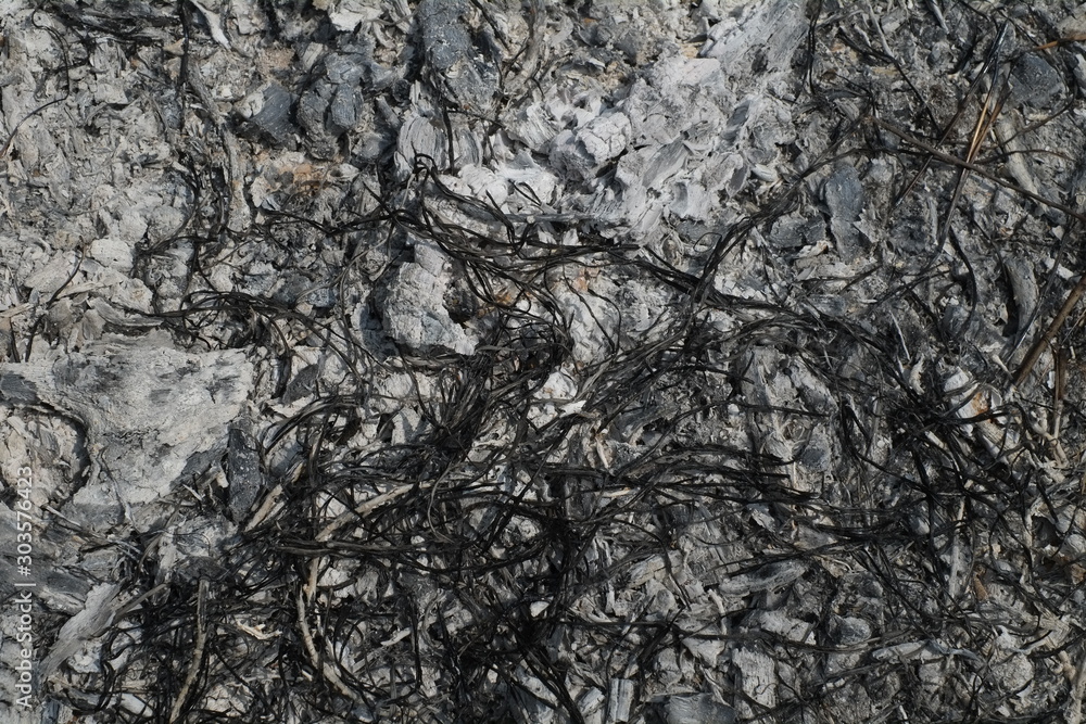 The ashes of the grass and the burning branches Ashes on the field after the fire