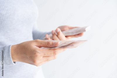 Asian woman hand counting money on white background. Money baht of thailand in her hand..