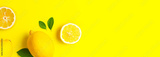 Creative background with fresh lemons and green leaves on bright yellow background. Top view flat lay copy space. Lemon fruit citrus minimal concept vitamin C. Composition with whole, slices of lemons