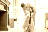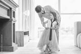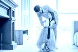 small girl wearing blue tie looking on her father standing near at home