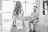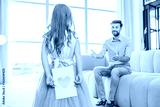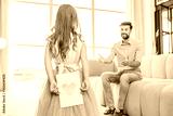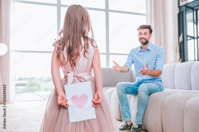 daughter holding picture of the heart behind her back while father sitting on the sofa in living room