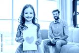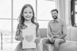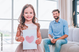 portrait of smiling girl holding picture of heart while father sitting on the sofa at home