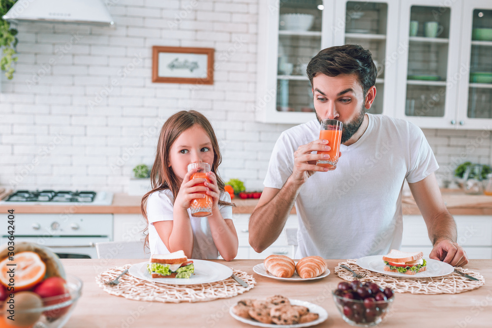 cute girl with her father drinking juice for breakfast on the kitchen together