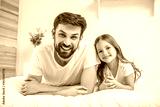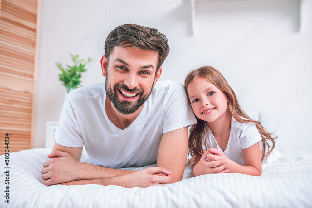 small daughter with her dad lying on the bed and smiling at the camera