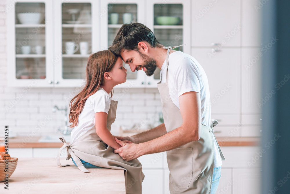 side view of father and girl wearing aprons looking at each other on the kitchen
