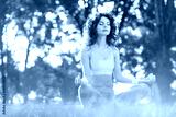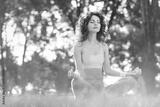 woman with closed eyes sitting in lotus position on yoga mat in the garden alone
