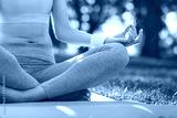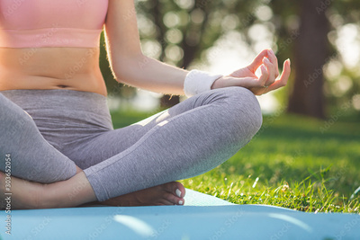 cropped shot of woman sitting in lotus position on the yoga mat in the park