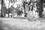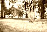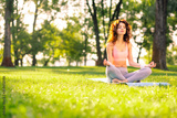woman sitting in lotus position with closed eyes on yoga mat in the park, copy space